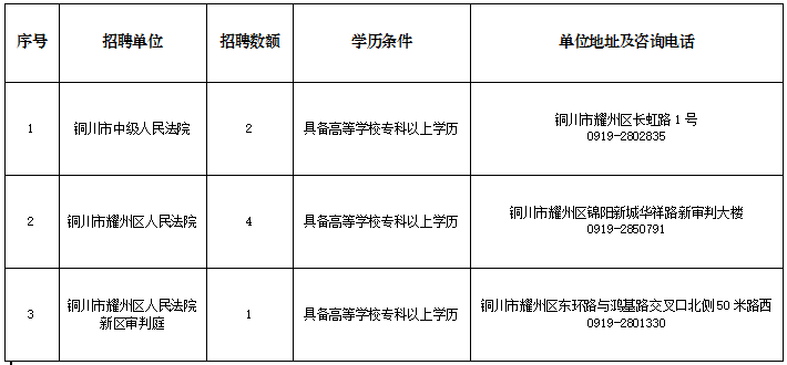 全市法院共招聘聘用制書(shū)記員7名,各法院招聘職位、地址及政策咨詢電話詳見(jiàn)《銅川法院2023年面向社會(huì)公開(kāi)招聘聘用制書(shū)記員職位表》(附件)。