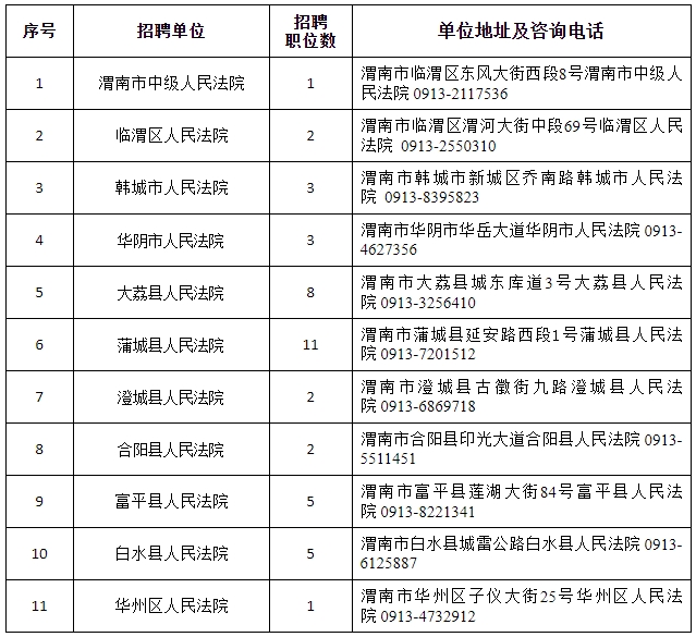 全市法院共招聘聘用制書記員43名,各法院招聘職位、地址及政策咨詢電話詳見《渭南法院2023年面向社會(huì)公開招聘聘用制書記員職位表》(附件)。
