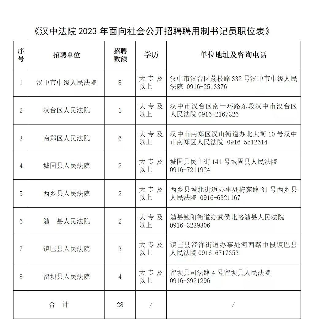 全市法院共招聘聘用制書記員28名,各法院招聘職位、地址及政策咨詢電話詳見《漢中法院2023年面向社會(huì)公開招聘聘用制書記員職位表》(附件)。